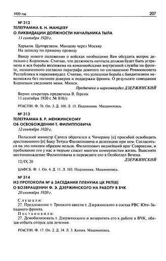 Из протокола № 6 заседания Пленума ЦК РКП(б) о возвращении Ф.Э. Дзержинского на работу в ВЧК. 20 сентября 1920 г. // РГАСПИ. Ф. 17. Оп. 2. Д. 34. Л. 3. Копия. Машинопись.