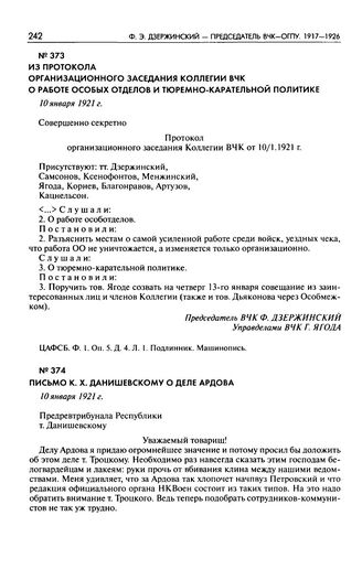 Письмо К.X. Данишевскому о деле Ардова. 10 января 1921 г. // ЦАФСБ. Ф. 1. Оп. 5. Д. 146. Л. 3. Копия. Машинопись.