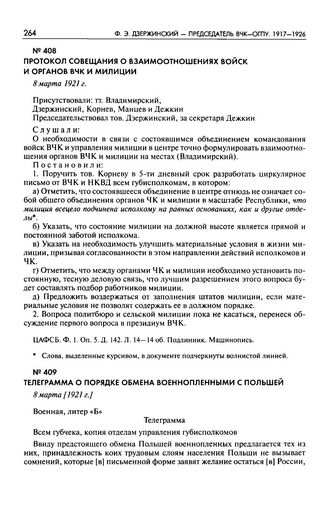 Телеграмма о порядке обмена военнопленными с Польшей. 8 марта [1921 г.] // ЦАФСБ. Ф. 66. Оп. 1. Д. 104. Л. 57. Подлинник. Машинопись.