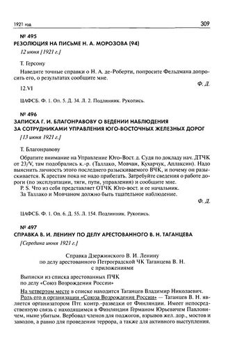 Справка В.И. Ленину по делу арестованного В.Н. Таганцева. [Середина июня 1921 г.] // ЦАФСБ. Ф. 1. Оп. 5. Д. 139. Л. 606. Копия с машинописной копии.