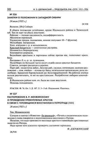 Распоряжение В.Р. Менжинскому о проведении превентивных арестов в связи с готовящимся восстанием в Петрограде. 26 июля [1921 г.]
