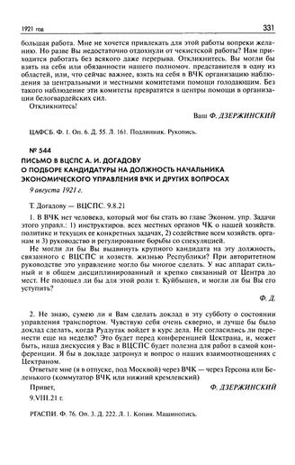 Главная Серия «Россия. XX век. Документы» Ф.Э.Дзержинский — председатель ВЧК—ОГПУ. 1917—1926 Письмо в ВЦСПС А.И. Догадову о подборе кандидатуры на должность нач...