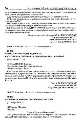 Письмо В.Н. Манцеву по разным вопросам. [11 ноября 1921 г.] // ЦАФСБ. Ф. 1. Оп. 5. Д. 122. Л. 292—293. Копия. Машинопись.