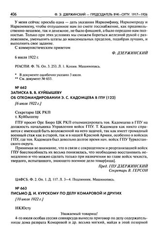 Письмо Д.И. Курскому по делу Комаровой и других. [10 июля 1922 г.] // РГАСПИ. Ф. 76. Оп. 3. Д. 254. Л. 1. Копия. Машинопись.