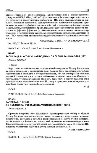 Записка Д.В. Усову о наблюдении за делом Ванифатьева. 25 июля [1922 г.] // РГАСПИ. Ф. 76. Оп. 3. Д. 337. Л. 1. Подлинник. Рукопись.