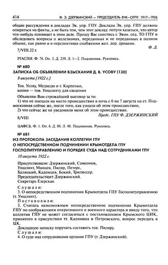 Из протокола заседания коллегии ГПУ о непосредственном подчинении Крымотдела ГПУ Госполитуправлению и порядке суда над сотрудниками ГПУ. 10 августа 1922 г. // ЦАФСБ. Ф. 1. Оп. 6. Д. 2. Л. 84—85. Подлинник. Машинопись.