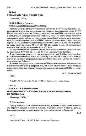 Записка Г.И. Благонравову о необходимости борьбы с бандитскими нападениями на поезда. 23 декабря [1923 г.] // ЦАФСБ. Ф. 2. Оп. 1. Д. 157. Л. 631. Подлинник. Рукопись.