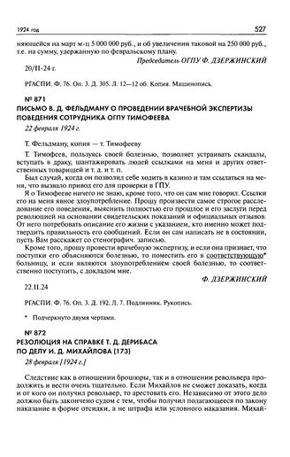 Главная Серия «Россия. XX век. Документы» Ф.Э.Дзержинский — председатель ВЧК—ОГПУ. 1917—1926 Резолюция на справке Т.Д. Дерибаса по делу И.Д. Михайлова. 28 февра...