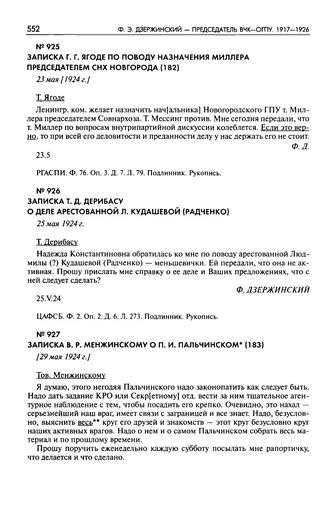 Записка Т.Д. Дерибасу о деле арестованной Л. Кудашевой (Радченко). 25 мая 1924 г. // ЦАФСБ. Ф. 2. Оп. 2. Д. 6. Л. 273. Подлинник. Рукопись.