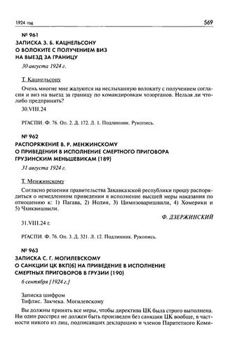 Распоряжение В.Р. Менжинскому о приведении в исполнение смертного приговора грузинским меньшевикам. 31 августа 1924 г.