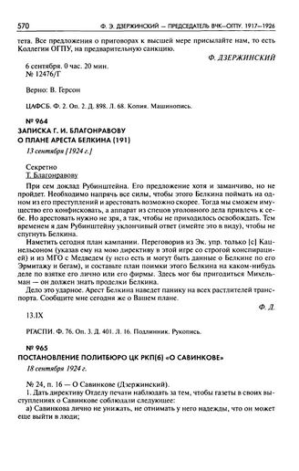 Записка Г.И. Благонравову о плане ареста Белкина. 13 сентября [1924 г.] // РГАСПИ. Ф. 76. Оп. 3. Д. 401. Л. 16. Подлинник. Рукопись.