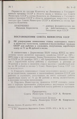 Главная Собрание законов и распоряжений правительства РСФСР и СССР Собрание законов и распоряжений Рабоче-Крестьянского Правительства ... Собрание постановлений правительства СССР за 1973 г. № 1-25 Документы Постановление Совета Министров СССР. Об утверждении пониженных став...