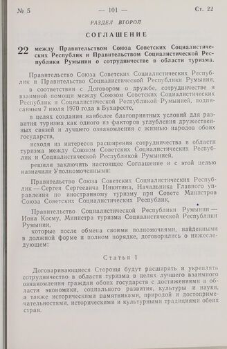 Соглашение между Правительством Союза Советских Социалистических Республик и Правительством Социалистической Республики Румынии о сотрудничестве в области туризма. Соглашение вступило в силу 23 октября 1972 года