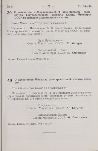 Постановление Совета Министров СССР. О заместителе Министра судостроительной промышленности. 10 апреля 1973 г. № 225