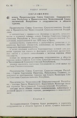 Соглашение между Правительством Союза Советских Социалистических Республик и Правительством Чехословацкой Социалистической Республики о сотрудничестве в области туризма. 8 июня 1972 г.