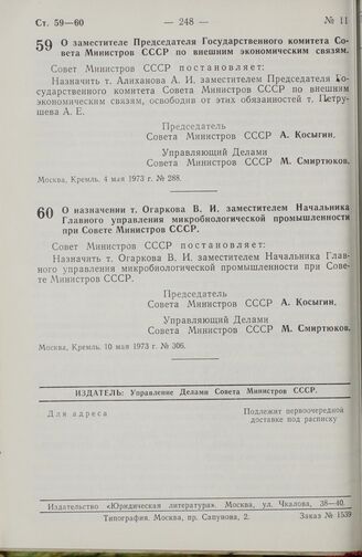 Постановление Совета Министров СССР. О заместителе Председателя Государственного комитета Совета Министров СССР по внешним экономическим связям. 4 мая 1973 г. № 288