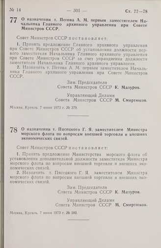 Постановление Совета Министров СССР. О назначении т. Пегова А. М. первым заместителем Начальника Главного архивного управления при Совете Министров СССР. 7 июня 1973 г. № 379