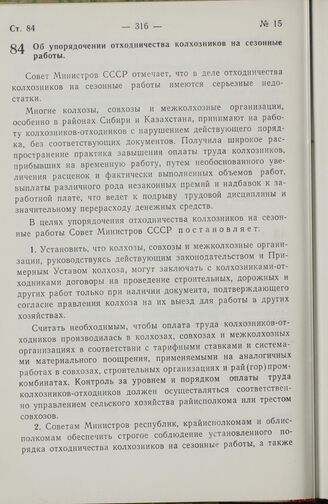 Постановление Совета Министров СССР. Об упорядочении отходничества колхозников на сезонные работы. 19 июня 1973 г. № 421