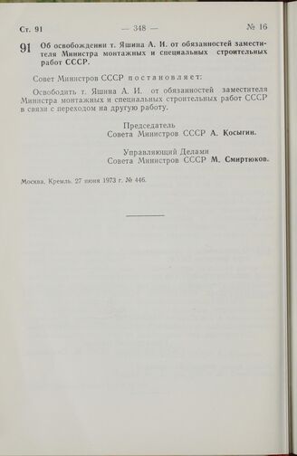 Постановление Совета Министров СССР. Об освобождении т. Яшина А. И. от обязанностей заместителя Министра монтажных и специальных строительных работ СССР. 27 июня 1973 г. № 446