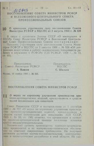Постановление Совета Министров РСФСР и Всесоюзного Центрального Совета Профессиональных Союзов. О признании утратившим силу постановления Совета Министров РСФСР и ВЦСПС от 2 августа 1968 г. № 526. 10 ноября 1989 г. № 325