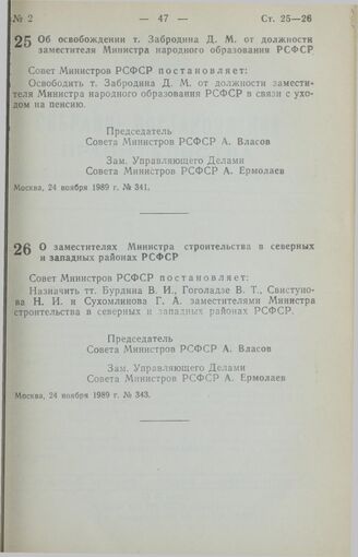 Постановление Совета Министров РСФСР. Об освобождении т. Забродина Д.М. от должности заместителя Министра народного образования РСФСР. 24 ноября 1989 г. № 341