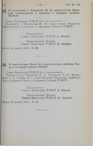 Постановление Совета Министров РСФСР. О назначении т. Резникова Ю.Ф. заместителем Министра строительства в северных и западных районах РСФСР. 25 декабря 1989 г. № 380