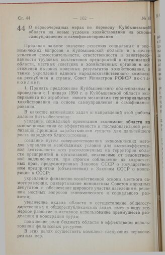 Постановление Совета Министров РСФСР. О первоочередных мерах по переводу Куйбышевской области на новые условия хозяйствования на основе самоуправления и самофинансирования. 29 декабря 1989 г. № 393
