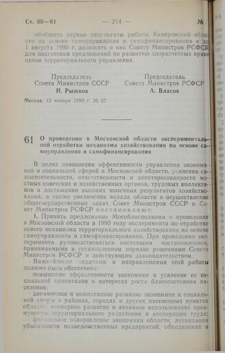 Постановление Совета Министров СССР и Совета Министров РСФСР. О проведении в Московской области экспериментальной отработки механизма хозяйствования на основе самоуправления и самофинансирования. 12 января 1990 г. № 38