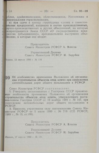 Постановление Совета Министров РСФСР. Об особенностях применения Положения об организации строительства объектов «под ключ» при сооружении автомобильных дорог общего пользования в РСФСР. 17 апреля 1990 г. № 123