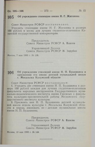 Постановление Совета Министров РСФСР. Об учреждении стипендии имени Н.Г. Жиганова. 7 мая 1990 г. № 138