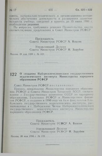 Постановление Совета Министров РСФСР. О создании Набережночелнинского государственного педагогического института Министерства народного образования РСФСР. 28 мая 1990 г. № 172