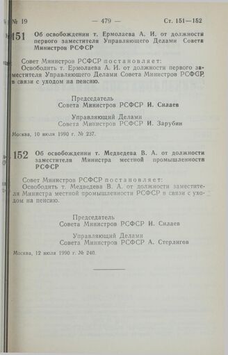 Постановление Совета Министров РСФСР. Об освобождении т. Медведева В.А. от должности заместителя Министра местной промышленности РСФСР. 12 июля 1990 г. № 240