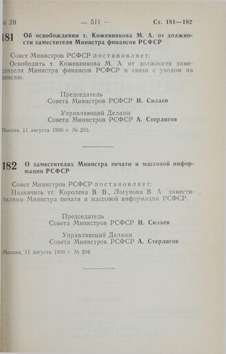 Постановление Совета Министров РСФСР. Об освобождении т. Кожевникова М.А. от должности заместителя Министра финансов РСФСР. 11 августа 1990 г. № 293
