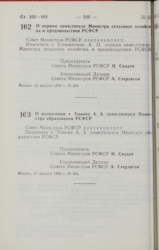 Постановление Совета Министров РСФСР. О назначении т. Ткжова А.А. заместителем Министра образования РСФСР. 17 августа 1990 г. № 306