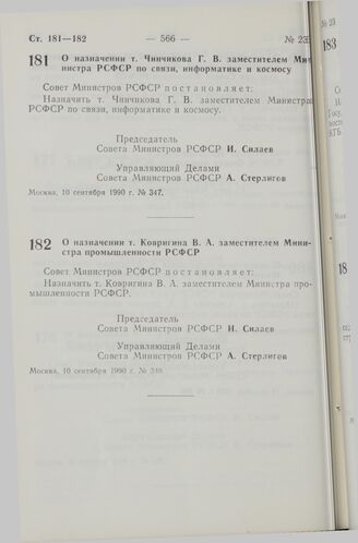 Постановление Совета Министров РСФСР. О назначении т. Ковригина В.А. заместителем Министра промышленности РСФСР. 10 сентября 1990 г. № 318