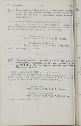Постановление Совета Министров РСФСР. Об освобождении т. Табеева Ф.А. от обязанностей Председателя Комитета по Государственным премиям РСФСР в области науки и техники при Совете Министров РСФСР. 30 сентября 1990 г. № 396