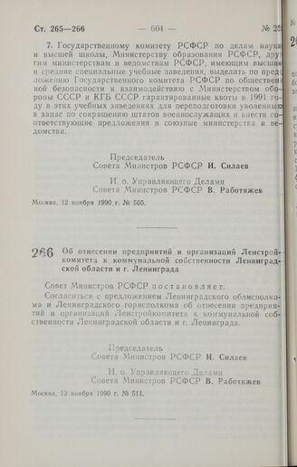 Постановление Совета Министров РСФСР. Об отнесении предприятий и организаций Ленстройкомитета к коммунальной собственности Ленинградской области и г. Ленинграда. 13 ноября 1990 г. № 511