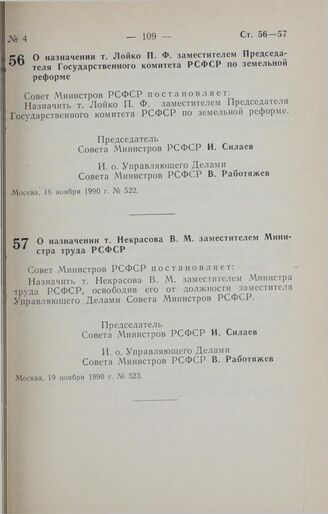 Постановление Совета министров РСФСР. О назначении т. Некрасова В. М. заместителем Министра труда РСФСР. 19 ноября 1990 г. № 523
