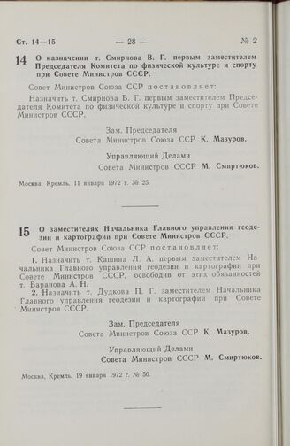 Постановление Совета Министров СССР. О назначении т. Смирнова В.Г. первым заместителем Председателя Комитета по физической культуре и спорту при Совете Министров СССР. 11 января 1972 г. № 25