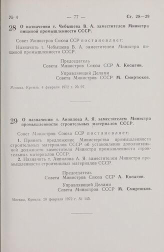 Постановление Совета Министров СССР. О назначении т. Анпилова А.Я. заместителем Министра промышленности строительных материалов СССР. 28 февраля 1972 г. № 145