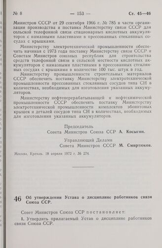Постановление Совета Министров СССР. Об утверждении Устава о дисциплине работников связи Союза ССР. 20 апреля 1972 г. № 284