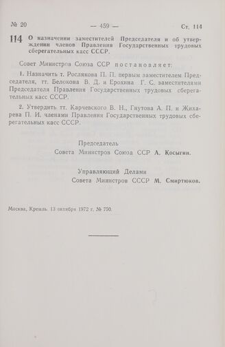 Постановление Совета Министров СССР. О назначении заместителей Председателя и об утверждении членов Правления Государственных трудовых сберегательных касс СССР. 13 октября 1972 г. № 750