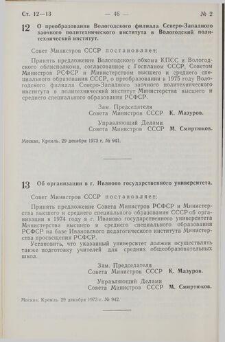 Постановление Совета Министров СССР. Об организации в г. Иваново государственного университета. 29 декабря 1973 г. № 942