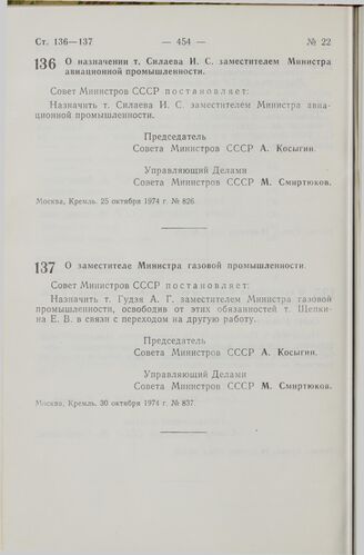 Постановление Совета Министров СССР. О назначении т. Силаева И.С. заместителем Министра авиационной промышленности. 25 октября 1974 г. № 826