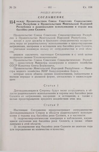 Соглашение между Правительством Союза Советских Социалистических Республик и Правительством Монгольской Народной Республики о рациональном использовании и охране вод бассейна реки Селенги. 3 июля 1974 г.