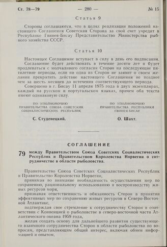 Соглашение между Правительством Союза Советских Социалистических Республик и Правительством Королевства Норвегии о сотрудничестве в области рыболовства. 11 апреля 1975 г.