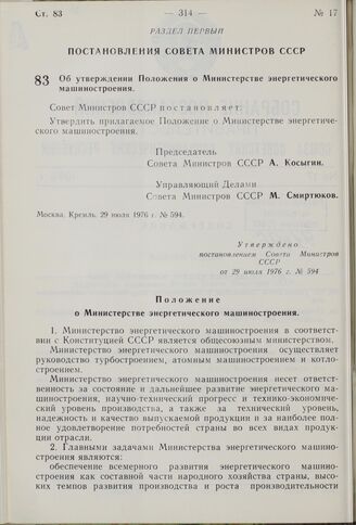 Постановление Совета Министров СССР. Об утверждении Положения о Министерстве энергетического машиностроения. 29 июля 1976 г. № 594