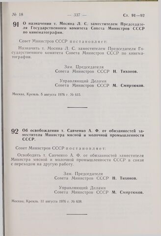Постановление Совета Министров СССР. О назначении т. Мосина Л.С. заместителем Председателя Государственного комитета Совета Министров СССР по кинематографии. 5 августа 1976 г. № 615