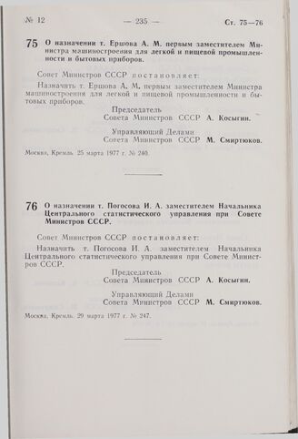 Постановление Совета Министров СССР. О назначении т. Ершова А.М. первым заместителем Министра машиностроения для легкой и пищевой промышленности и бытовых приборов. 25 марта 1977 г. № 240