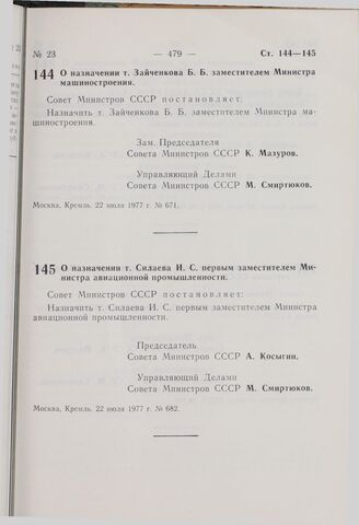 Постановление Совета Министров СССР. О назначении т. Зайченкова Б.Б. заместителем Министра машиностроения. 22 июля 1977 г. № 671
